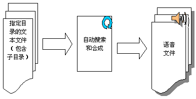 系統(tǒng)功能實(shí)現(xiàn)示意圖如下圖,離線合成系統(tǒng)可以自動(dòng)搜索指定目錄(可包含子目錄)的文本文件,并按指定的規(guī)則生成相應(yīng)的語音文件。