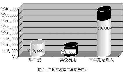 就中國目前的經(jīng)濟(jì)水平而言,一個(gè)座席人員年收入(包括工資、獎(jiǎng)金、福利等等)大約為¥10,000,而每個(gè)座席人員所配備的軟硬件設(shè)施合計(jì)約為¥5,000;據(jù)專業(yè)機(jī)構(gòu)統(tǒng)計(jì),中國的座席人員平均穩(wěn)定的工作年限為三年,而在這三年為了保證座席人員能夠準(zhǔn)確、高效的實(shí)現(xiàn)對(duì)用戶提供專業(yè)服務(wù),所投入的培訓(xùn)費(fèi)用大約為¥3,000。所以在三年期間為每個(gè)座席的平均花費(fèi)為¥38,000。