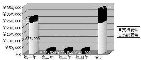 2) 語音合成投入費(fèi)用 科大訊飛公司語音合成技術(shù)以及硬件設(shè)備的折舊期為四年,而就經(jīng)過大量統(tǒng)計(jì)所得到的數(shù)據(jù)證明,采用語音技術(shù)后的一個(gè)72線的IVR系統(tǒng),大約可以完成一個(gè)中型的呼叫中心(配備100座席人員)所能提供的60%的業(yè)務(wù)。下圖為采用訊飛語音合成技術(shù)建設(shè)這樣的IVR系統(tǒng)的投入。