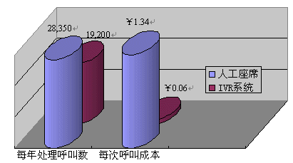 據(jù)統(tǒng)計(jì),一個(gè)72線的IVR系統(tǒng)每年能夠處理2,300,000的接入電話,平均每線IVR一年能夠處理32,000個(gè)接入電話,依照60%的有效話務(wù)處理率(即80%的接入電話可以不轉(zhuǎn)人工即可完成服務(wù))來計(jì)算,即四年期每線的投入¥4569總共可以處理76,800個(gè)電話,即便是計(jì)算上系統(tǒng)維護(hù)費(fèi)用,平均處理每個(gè)電話的成本僅為0.06元。