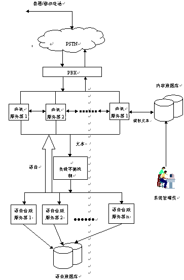 當用戶通過電話向聲訊服務(wù)器發(fā)出請求時,聲訊服務(wù)器會首先作出分析判斷,然后從內(nèi)容數(shù)據(jù)庫中提取相應(yīng)的文本信息,經(jīng)過負載平衡機制發(fā)送給語音合成服務(wù)器。語音合成服務(wù)器在接收到文本后立刻開始合成,同時將合成好的語音發(fā)送回語音服務(wù)器,再由語音服務(wù)器回傳給用戶。其中內(nèi)容數(shù)據(jù)庫中的信息可以由系統(tǒng)管理員定期進行維護管理。(系統(tǒng)連接結(jié)構(gòu)見流程圖)