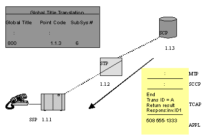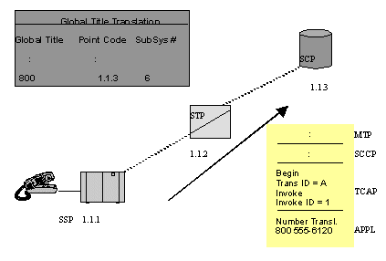 主叫用戶拔叫800用戶號,這就觸發(fā)位于交換局(圖中SSP)內(nèi)的路由應用程序發(fā)出一個TCAP查詢。圖中的STP收到查詢,用MTP層和SCCP層協(xié)議轉(zhuǎn)發(fā)查詢到SCP的800號碼數(shù)據(jù)庫。這樣,SSP中的應用程序就和SCP直接建立了對話。