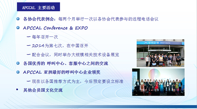為了亞洲各國的與呼叫中心、客服中心相關(guān)的產(chǎn)業(yè)信息的共享和通過實質(zhì)性的交流,以更好的相互發(fā)展各會員國的呼叫中心、客服中心產(chǎn)業(yè)為目的。