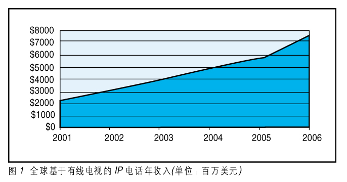 有線電視運(yùn)營商在尋找使用有線電視基礎(chǔ)網(wǎng)絡(luò)HFC的新服務(wù),創(chuàng)造新的經(jīng)濟(jì)增長點(diǎn),提供數(shù)據(jù)、語音、圖像綜合的服務(wù);谟芯電視系統(tǒng)的IP電話將是第一個最有可能推出的新服務(wù)。2002年InStat/MDR的分析報告說2006年基于有線電視的IP電話網(wǎng)將達(dá)到US$75億的年收入,如圖1所示。