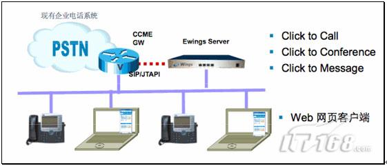 點點通系統(tǒng)配置一臺CISCO 2811集成多業(yè)務路由器設備,能提供CCME IP電話的支持,并且可以跟企業(yè)內部的現有電話系統(tǒng)對接。另外,點點通系統(tǒng)還有一臺服務器,這是思科的合作伙伴提供的硬件和軟件,通過它實現和公司目錄的集成和各種對電話的控制功能。這臺服務器和CCME之間采用SIP或JTAPI的連接。
