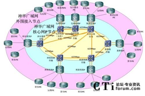 據(jù)神華集團(tuán)信息管理部廣域網(wǎng)項(xiàng)目負(fù)責(zé)人說(shuō):“該項(xiàng)目建成后將是一個(gè)建設(shè)在高速傳輸網(wǎng)平臺(tái)之上,并利用其提供的線路構(gòu)成廣域網(wǎng)核心節(jié)點(diǎn)之間的互聯(lián)線路,網(wǎng)絡(luò)拓?fù)湓?個(gè)核心節(jié)點(diǎn)和以北京節(jié)點(diǎn)為中心直連7個(gè)核心節(jié)點(diǎn)的放射型622M環(huán)形+放射混合性企業(yè)頂級(jí)骨干廣域數(shù)據(jù)網(wǎng)絡(luò)結(jié)構(gòu)。該網(wǎng)絡(luò)結(jié)構(gòu)可避免任一段光纜中斷造成某節(jié)點(diǎn)直連線路和環(huán)線同時(shí)中斷的可能性,即對(duì)網(wǎng)絡(luò)單點(diǎn)故障實(shí)現(xiàn)環(huán)路保護(hù)。同時(shí),網(wǎng)絡(luò)中斷到恢復(fù)的周期大大縮短:傳輸系統(tǒng)中SDH的環(huán)路自愈從中斷到恢復(fù)周期為50ms,網(wǎng)絡(luò)節(jié)點(diǎn)之間通過(guò)IGP的路由收斂,從中斷到恢復(fù)的周期約為200ms。”