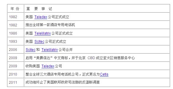 Cetis(美爵信達(dá)) 是全球酒店客房/辦公電話(huà)機(jī)的領(lǐng)導(dǎo)企業(yè),全球總部位于美國(guó)丹佛,在世界各地設(shè)有生產(chǎn)基地、銷(xiāo)售網(wǎng)絡(luò)及服務(wù)機(jī)構(gòu),并在全球擁有7000多家授權(quán)代理商。2009年12月18日,Cetis(美爵信達(dá))在全球 CEO 孫炳南博士的領(lǐng)導(dǎo)下,正式收購(gòu)了全球最大的酒店專(zhuān)用電話(huà)機(jī)公司—— 美國(guó)Teledex(德利達(dá))公司,成為世界上最大、擁有全球酒店客房話(huà)機(jī)三大頂級(jí)品牌公司的龍頭企業(yè)。