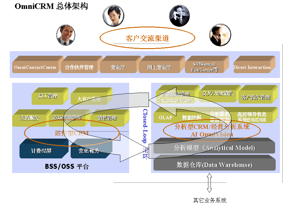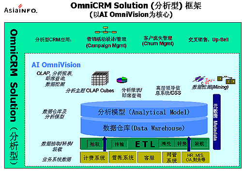 OmniCRM方案是亞信基于多年服務(wù)電信市場(chǎng)的豐富的行業(yè)經(jīng)驗(yàn),以及對(duì)國(guó)內(nèi)運(yùn)營(yíng)商業(yè)務(wù)發(fā)展的深刻認(rèn)識(shí)而推出的,其中,AI OmniVision是OmniCRM方案中經(jīng)營(yíng)分析型CRM 的核心產(chǎn)品。AI OmniVision不僅符合行業(yè)業(yè)務(wù)規(guī)范,而且基于對(duì)客戶行為、競(jìng)爭(zhēng)環(huán)境,商業(yè)獲利率以及其他參數(shù)的透徹分析,能夠使運(yùn)營(yíng)商充分了解現(xiàn)有客戶、識(shí)別并關(guān)注贏利的客戶組、提高服務(wù)質(zhì)量、確?蛻魸M意度和忠誠(chéng)度;同時(shí)吸引潛在的客戶;加強(qiáng)提供新服務(wù)的投資回報(bào)率;提高效率、減小成本,以實(shí)現(xiàn)業(yè)務(wù)價(jià)值的最大化。AI OmniVision采用數(shù)據(jù)倉庫、ETL、OLAP分析、靈活報(bào)表展現(xiàn)及數(shù)據(jù)挖掘等技術(shù),包含了用戶分析、業(yè)務(wù)分析、收益分析、大客戶分析、營(yíng)銷分析、競(jìng)爭(zhēng)分析、服務(wù)質(zhì)量、新業(yè)務(wù)分析等眾多功能模塊。