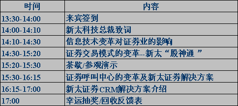 與高交會(huì)同期的還有10月15日下午在投資大廈4樓多功能廳舉行的新太“股神通”產(chǎn)品發(fā)布會(huì)暨證券業(yè)務(wù)解決方案研討會(huì)(詳細(xì)情況請看邀請函)。