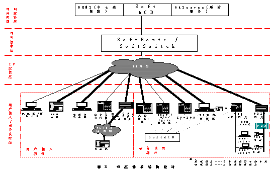 用戶接入層―――通過媒體網(wǎng)關(guān)將PSTN網(wǎng)絡(luò)或移動(dòng)GSM或CDMA網(wǎng)絡(luò)的客戶服務(wù)請求通過H323協(xié)議和RTP協(xié)議統(tǒng)一接入到IP網(wǎng)絡(luò)中來;用戶也可以通過IP話機(jī)器或多媒體軟話機(jī)直接接入到呼叫中心系統(tǒng)中來;部分客戶還可以通過文本聊天工具接入到呼叫中心.
