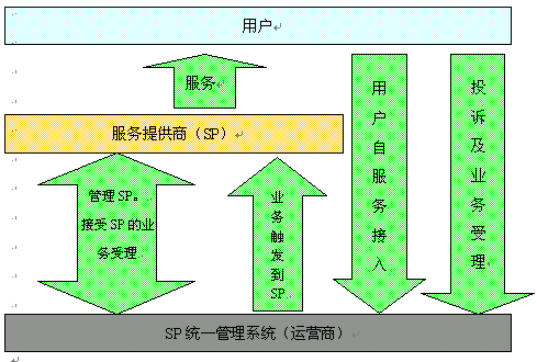 在對SP統(tǒng)一管理的過程中,SP、新太科技、運營商、運營商用戶組成了一條完整的價值鏈,如下圖所示: