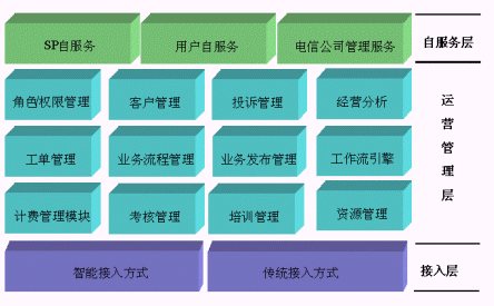 SP統(tǒng)一管理系統(tǒng)從功能邏輯上劃分,我們歸納為三大功能層來對系統(tǒng)進行總體的介紹:接入層、運營管理層、自服務(wù)層。如下圖所示: