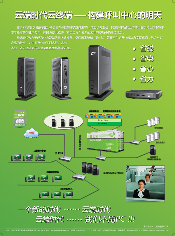 云端時代是由有中國寬帶先生之稱的,成功創(chuàng)辦亞信、網(wǎng)通并帶領(lǐng)其上市的田溯寧博士旗下寬帶資本投資的創(chuàng)業(yè)型公司。同時也是北京市“祥云工程”計劃資助的云計算基地中的重要成員。 云端時代致力于成為業(yè)內(nèi)領(lǐng)先的云終端設(shè)備、桌面云系統(tǒng)和“云+端”管理平臺的整體解決方案提供商,幫助中國企業(yè)向 “云+端”架構(gòu)轉(zhuǎn)型。 云端時代的管理團隊由具有國際化背景和本地化經(jīng)驗的優(yōu)秀人才構(gòu)成,核心成員來自國內(nèi)外知名的瘦客戶機設(shè)備廠商、嵌入式芯片廠商、集成電路企業(yè)以及通訊企業(yè)等。如:AMD、聯(lián)想、威盛、升騰、Wyse、控創(chuàng)等等。