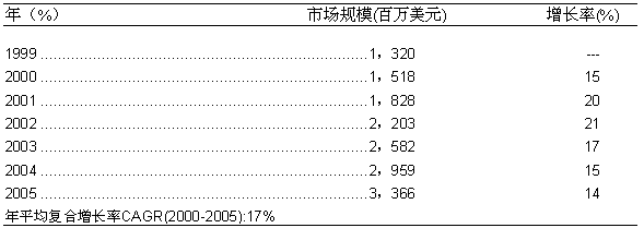 如圖一所示,1999年,美國的固定網(wǎng)OSS服務保障的市場規(guī)模約為13.2億美元。而在2000年,這一市場比上一年增長了15%,達到15.18億美元。根據(jù)Frost & Sullivan的預測,從2000年到2005年間,美國的固定網(wǎng)OSS服務保障市場的年平均復合增長率將高達17%,市場規(guī)模在2005年預計會增長至33.66億美元。