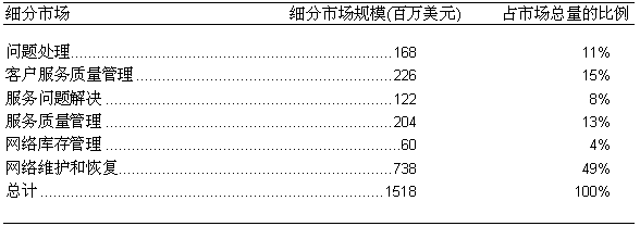 如圖二所示, 2000年, 在美國的固定網(wǎng)OSS服務保障市場的六個細分市場中, 規(guī)模最大的是網(wǎng)絡維護和恢復市場, 市場總額約為7.38億美元, 占整個市場的49%; 而規(guī)模最小的是網(wǎng)絡庫存管理市場, 市場總額約為6千萬美元, 僅占整個市場的4%左右。