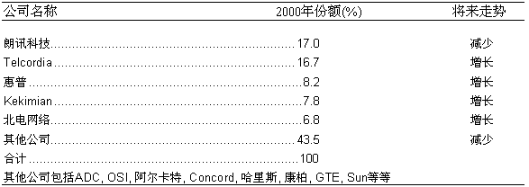 從目前市場情況來看,美國的固定網(wǎng)OSS服務保障的市場集中度相當高。在市場中領先的公司一共有5家,它們分別是朗訊科技、Telcordia科技、惠普公司、Hekimian和北電網(wǎng)絡。這五家公司均是較早進入這一市場的老牌公司。2000年,它們在固定網(wǎng)OSS服務保障領域的銷售額總和為8.60億美元,約占整個市場的56.5%左右,另外43.5%的市場被約其他二十多家廠商分割。