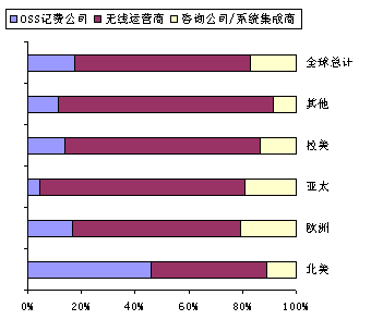 圖1、無線OSS計(jì)費(fèi)市場(chǎng):2000年全球按照地區(qū)劃分的不同公司類型的整體市場(chǎng)收入估計(jì)(百萬美元)