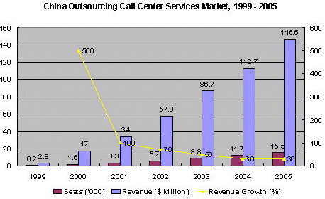 Frost & Sullivan公司研究表明在2000年,中國外包呼叫中心服務(wù)市場價(jià)值1700萬美元,共有1600坐席。本座席數(shù)是按照實(shí)際工作量來計(jì)算的,物理上存在的坐席數(shù)要超過2300個。因?yàn)樵S多坐席是在2000年下半年末才建成投入使用的,并且工作任務(wù)也沒有滿負(fù)荷。