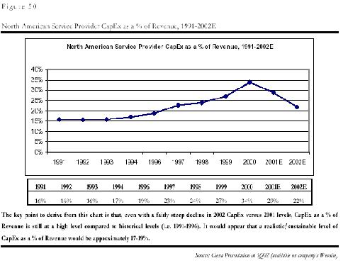 和中國的問題一樣,制造商的問題是電信服務企業(yè),即運營商的投入減少造成的。由于上世紀末互聯(lián)網和電子商務泡沫的虛假繁榮的影響,各運營商都嚴重高估了市場需求,認為需求是會隨著通信能力的增強無限增加,因此市場規(guī)模是會無限擴張的,他們在缺乏對最終用戶需求的深入分析的前提下,普遍在基礎設施的建設上進行了超大規(guī)模的投入,其基礎設施建設投入在收入中的比例一度在2000年從平均的15%達到了創(chuàng)記錄的35%!