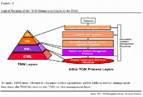 國(guó)際電聯(lián)的出發(fā)點(diǎn)雖好,但它更強(qiáng)調(diào)從網(wǎng)絡(luò)元素層開(kāi)始的清晰的統(tǒng)一體系,而為了保護(hù)自己的商業(yè)秘密,各大運(yùn)營(yíng)商往往不希望公開(kāi)自己的網(wǎng)絡(luò)元素層的標(biāo)準(zhǔn),同時(shí),網(wǎng)絡(luò)元素層的標(biāo)準(zhǔn)化對(duì)運(yùn)營(yíng)商的業(yè)務(wù)發(fā)展幫助不大。在熱烈討論了一段時(shí)間之后,TMN漸漸被忽視了。而另一只希望從技術(shù)角度解決管理問(wèn)題的力量,電信管理論壇,卻帶有一定偶然性地逐漸確立了自己的地位。電信管理論壇在開(kāi)始的時(shí)候并沒(méi)有夢(mèng)想能建立覆蓋整個(gè)電信運(yùn)營(yíng)企業(yè)的管理系統(tǒng),其初衷是解決在當(dāng)時(shí)日漸突出的跨企業(yè)的客戶數(shù)據(jù)交換問(wèn)題。因此,和國(guó)際電聯(lián)不同,電信管理論壇從開(kāi)始就非常強(qiáng)調(diào)實(shí)用性,并把目光集中到了各企業(yè)相互間有大量數(shù)據(jù)交換,因此迫切需要建立標(biāo)準(zhǔn)的服務(wù)管理層和網(wǎng)絡(luò)管理層,并提出了電信運(yùn)營(yíng)支持系統(tǒng)(OSS)的概念,并公布了模塊化的電信運(yùn)營(yíng)導(dǎo)圖(TOM)。