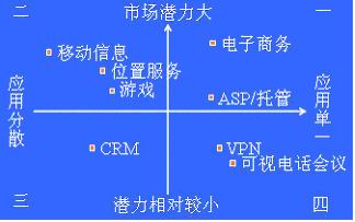 * 第三象限:市場(chǎng)潛力比較小,應(yīng)用比較分散。由于經(jīng)營(yíng)靈活,貼近客戶,小服務(wù)提供商在此會(huì)有非常大的優(yōu)勢(shì)。大型運(yùn)營(yíng)商如想經(jīng)營(yíng)此象限內(nèi)的業(yè)務(wù),必須努力減小不同用戶需求的差異,并造成成本領(lǐng)先。如客戶關(guān)系管理(CRM)。