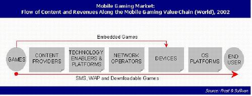如果市場(chǎng)潛力足夠大,那么選擇適當(dāng)?shù)臉I(yè)務(wù)模式就是實(shí)現(xiàn)市場(chǎng)潛力的保證。而業(yè)務(wù)模式的選擇是與業(yè)務(wù)的市場(chǎng)價(jià)值鏈分不開(kāi)的。在一些市場(chǎng)價(jià)值鏈較復(fù)雜的應(yīng)用中,業(yè)務(wù)模式的選擇尤為重要,例如,下圖所示的移動(dòng)游戲的價(jià)值鏈就是較復(fù)雜的一個(gè):