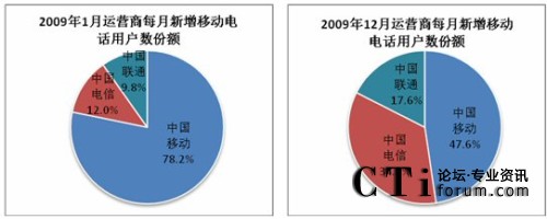 考查三大運(yùn)營商2009年的每月新增用戶數(shù)份額:中國移動每月新增用戶數(shù)份額從1月的78.2%下降到12月的47.6%,顯然,中國移動每月用戶增速逐漸放緩,而中國電信和中國聯(lián)通的每月新增用戶數(shù)份額呈增長趨勢。