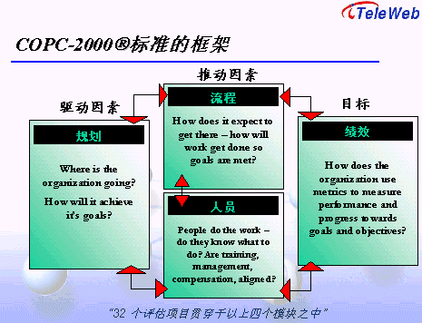 COPC-2000®標準提供呼叫中心規(guī)劃與領(lǐng)導、流程管理、人員管理、績效考核四大類32項指標的評估基準,內(nèi)容涵蓋財務(wù)成本、客戶滿意度、客戶投訴、服務(wù)與質(zhì)量、組織結(jié)構(gòu)、人力資源運用、員工考核及士氣等呼叫中心管理的所有方面。具體架構(gòu)見下圖。