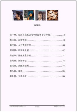 b) 現(xiàn)代客戶服務(wù)中心的管理框架已經(jīng)基本形成。我們?yōu)槭斜弊詠?lái)水客戶服務(wù)中心編輯了一套呼叫中心運(yùn)營(yíng)管理手冊(cè),其中分為經(jīng)理版和客戶服務(wù)代表版,其中包含了呼叫中心的規(guī)章制度,運(yùn)作流程,人力資源管理等內(nèi)容。