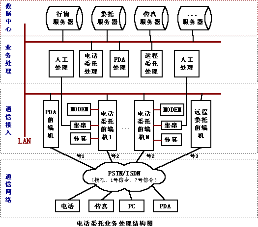 第一種方案是在證券營(yíng)業(yè)部加專(zhuān)用的前端機(jī)和處理機(jī),申請(qǐng)獨(dú)立的電話線路來(lái)處理PDA的委托,PDA和營(yíng)業(yè)部前端機(jī)采用雙向或單向的DTMF收發(fā)的方式完成通訊。根據(jù)市場(chǎng)的情況來(lái)看,這種方式不容易被證券營(yíng)業(yè)部和股民接受,證券營(yíng)業(yè)部要申請(qǐng)一定數(shù)量的電話線路,和證券電話委托的線路不能共用,增加了營(yíng)業(yè)部的費(fèi)用。由于線路的限制,股民在做委托查詢時(shí)往往出現(xiàn)線路阻塞等情況,另外DTMF通訊方式的有速度慢,信息容量有限,抗干擾性差等缺點(diǎn),股民不容易接受。目前東方潮公司的“東方獵人”的委托就是采用這種方式。