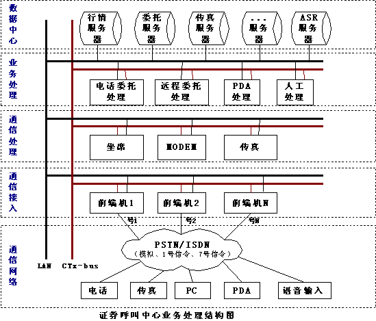 另一種方案是PDA和證券營(yíng)業(yè)部前端機(jī)(實(shí)際就是電話委托前端機(jī))采用FSK通訊方式,使用電話委托的通道來(lái)完成所有的委托查詢。這種方式的速度快,信息容量大,保密性強(qiáng),而且營(yíng)業(yè)部不需單獨(dú)申請(qǐng)電話線路,PDA和電話委托線路可動(dòng)態(tài)分配,使其電話線路得到最大限度的利用。另外,營(yíng)業(yè)部對(duì)外形象也好,只用一個(gè)號(hào)碼就可讓股民完成電話委托、PDA委托等多種委托方式,給股民帶來(lái)了方便。不過(guò)這種方式需要得到電話語(yǔ)音卡提供廠商的產(chǎn)品技術(shù)支持,語(yǔ)音卡必須同時(shí)支持標(biāo)準(zhǔn)的DTMF和FSK的方式,卡上有充足的能力來(lái)處理兩種方式,在語(yǔ)音處理卡的底層驅(qū)動(dòng)應(yīng)該將電話和PDA的委托區(qū)別開(kāi)來(lái),目前市場(chǎng)能夠完全支持這種應(yīng)用的只有深圳市東進(jìn)通訊技術(shù)股份有限公司的產(chǎn)品,東進(jìn)技術(shù)的新一代PCI系列語(yǔ)音卡數(shù)字卡和模擬卡都完全采用DSP(數(shù)字信號(hào)處理器)架構(gòu),卡上有專(zhuān)用DSP來(lái)處理DTMF和FSK的收發(fā),是目前PDA委托前端的最好選擇;這種方案還應(yīng)該得到證券電話委托系統(tǒng)的開(kāi)發(fā)商的支持,在電話委托系統(tǒng)里增加處理PDA委托的功能。目前恒基偉業(yè)的“股靈通”就是采用這種方式。