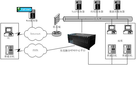 to Talk)”發(fā)展到“點擊到交談(Click to Talk)”,通過Internet可以提供IP電話語音呼叫、Call Back、IP傳真、IM、E-mail等功能,擴展了通信渠道,一方面用戶可以實現(xiàn)免費接入到呼叫中心,另一方面企業(yè)能夠向更多的客戶提供優(yōu)質(zhì)、方便的服務資源,而且由于這些資源的價格相對傳統(tǒng)通信便宜,使企業(yè)為客戶提供全國、乃至于全球服務成為可能,提高了企業(yè)客戶服務水平,增強了企業(yè)競爭力。東進互聯(lián)網(wǎng)呼叫中心系統(tǒng)結(jié)構(gòu)如圖所示: