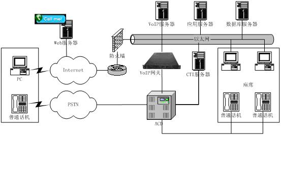 當客戶訪問企業(yè)網(wǎng)站,需要與企業(yè)客戶服務人員語音交流時,點擊“Call me”按鈕,如果客戶是第一次使用此功能,客戶終端會自動下載一個服務程序(對于Skype方式,會自動下載Skype軟件),并啟動服務窗口,用戶通過此窗口即可與呼叫中心進行交互,座席也將從服務器下載一個服務程序和用戶進行交互,并可通過互聯(lián)網(wǎng)實現(xiàn)遠程座席。