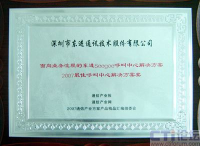 10月23日,中國國際通信設備技術展覽會國際通信展覽會開幕當天,由通訊產(chǎn)業(yè)報社主辦的2007通信產(chǎn)業(yè)方案產(chǎn)品精品評選活動頒獎典禮隆重舉行,東進技術的“面向業(yè)務流程的東進Seegoe呼叫中心解決方案”榮獲2007最佳呼叫中心解決方案獎。