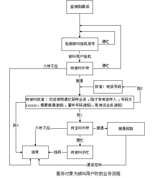 當(dāng)服務(wù)對(duì)象是被叫用戶(hù)時(shí),產(chǎn)生遇忙漏話(huà)后,東進(jìn)漏話(huà)監(jiān)測(cè)設(shè)備(DMCS)實(shí)時(shí)檢測(cè)被叫用戶(hù)的掛機(jī)信號(hào),如果被叫掛機(jī),則先向被叫外呼,呼出接通后,語(yǔ)音提示“歡迎使用遇忙回呼業(yè)務(wù),剛才有電話(huà)呼入,號(hào)碼為xxxxxx,需要接通請(qǐng)按1,重聽(tīng)號(hào)碼請(qǐng)按2,取消該業(yè)務(wù)請(qǐng)按3”,如按1,系統(tǒng)向原主叫外呼(亦稱(chēng)回呼),回呼成功(ACM)后,建立話(huà)音回路,進(jìn)一步接續(xù);如回呼原主叫時(shí)遇忙(SLB、STB等),則回呼失敗,向被叫用戶(hù)示忙。