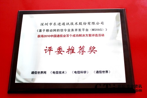 從2010年7月起評選進入征集階段,經過長達3個月的層層篩選,最終百個成功解決方案出爐,并由多家主流媒體公示。東進技術“基于移動網的信令業(yè)務開發(fā)平臺(MSVAS)”解決方案憑借出眾的實用經濟性、安全可靠性、靈活性和成熟性,經過兩個月網絡初選,和近百位運營商層面專業(yè)人士組成的組委會技術終選后獲此殊榮。