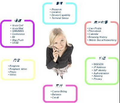 三是開放電信能力,運營商手里有很多得天獨厚的資源,如SMS、MMS、語音等可靠的通信服務(wù),用戶數(shù)據(jù),情境,認證等。這些是運營商獨有的資源,在此基礎(chǔ)上開發(fā)出來的應(yīng)用也是獨一無二的。