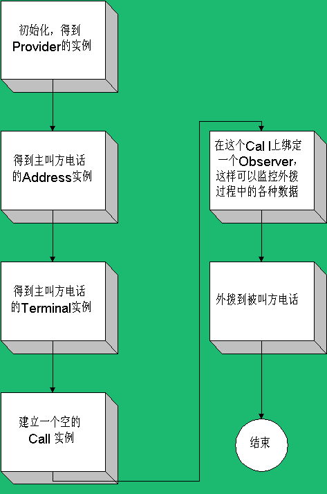 JTAPI利用OBSERVER的概念來進(jìn)行各種消息處理。OBSERVER直譯過來是觀察者的意思,顧名思義,OBSERVER就是對(duì)每個(gè)呼叫對(duì)象進(jìn)行“觀察”工作。它的工作流程是“綁定到專門對(duì)象》觀察專門對(duì)象》獲取專門對(duì)象的信息》分析并匯報(bào)專門對(duì)象的信息”。