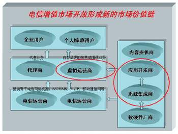 在電信增值市場開放的背景之下,新的市場價值鏈正在形成(如圖所示)。國內(nèi)電信建設(shè)轟轟烈烈的大規(guī);A(chǔ)設(shè)施投資已是明日黃花,改善應(yīng)用“稀缺”的現(xiàn)狀才是當務(wù)之急。李峻認為,信息產(chǎn)品技術(shù)服務(wù)提供商最主要的任務(wù),就是幫助運營商開發(fā)針對中國市場的增值業(yè)務(wù),并帶動其主業(yè)協(xié)同發(fā)展。即面向電信網(wǎng)絡(luò)運營商以及虛擬運營商,提供增值業(yè)務(wù)系統(tǒng)整體解決方案及其軟硬件支撐平臺和應(yīng)用系統(tǒng)。