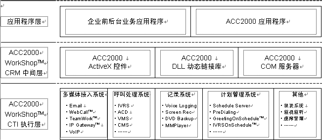 ACC2000 Workshop是聲訊科技集團為基于Microsoft Windows操作系統(tǒng)的CRM應(yīng)用軟件開發(fā)所建立的開發(fā)平臺(中間件)。以ACC2000 Workshop為基礎(chǔ)的ACC2000集成多媒體溝通中心采用三層結(jié)構(gòu),利用ACC2000 Workshop的CRM中間層所提供的ActiveX控件、DLL動態(tài)庫以及COM組件,就可以很容易地將溝通中心的各種功能融合到前端應(yīng)用程序中。ACC2000 Workshop的CTI執(zhí)行層接受中間件發(fā)來的請求,處理ACC2000的各項服務(wù)功能,并向CRM應(yīng)用程序返回執(zhí)行結(jié)果。見下圖。