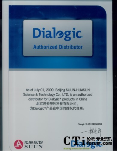 2009年7月1日DIALOGIC公司為其大陸地區(qū)DIALOGIC產(chǎn)品總代理-------北京思安華勝科技有限公司頒發(fā)了09版的代理證書,新的代理證書不僅在版面和內(nèi)容上與以往有所不同,更重要的是說(shuō)明了代理的產(chǎn)品范圍(由于新近收購(gòu)的NMS、Cantata等產(chǎn)品,國(guó)內(nèi)原來(lái)就有代理商,現(xiàn)在所有產(chǎn)品都在Dialogic旗下,為了避免發(fā)生混淆和誤會(huì),本次的代理證書增加了附頁(yè),附頁(yè)里面規(guī)定了代理商所代理的產(chǎn)品的范圍,我們歡迎朋友們以各種形式來(lái)我公司或Dialogic公司北京代表處咨詢和驗(yàn)證)。此舉強(qiáng)調(diào)了渠道的正規(guī)性和權(quán)威性,北京思安華勝公司目前是DIALOGIC公司原DIALOGIC系列產(chǎn)品在中國(guó)的唯一總代理,承擔(dān)著Dialogic系列產(chǎn)品的銷售、市場(chǎng)推廣、技術(shù)支持、售后服務(wù)、保修服務(wù)等一系列重要工作。