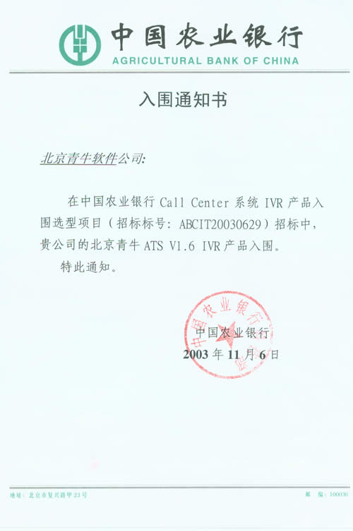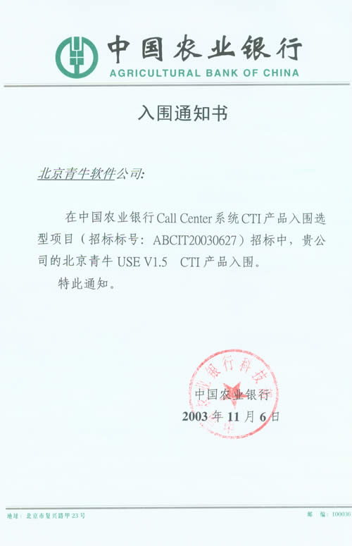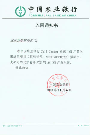 北京青牛軟件技術(shù)有限責任公司憑借多年來深厚的技術(shù)基礎(chǔ)、完善的咨詢服務(wù)和優(yōu)異的產(chǎn)品表現(xiàn),在本次CTI產(chǎn)品、IVR產(chǎn)品入圍選型項目中脫穎而出。青牛軟件此次入圍中國農(nóng)業(yè)銀行總行Call
