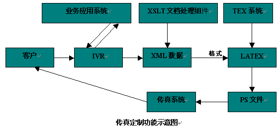 用戶通過IVR與業(yè)務應用系統(tǒng)交互,獲得所需的傳真數(shù)據(jù),這些傳真數(shù)據(jù)在系統(tǒng)中以XML數(shù)據(jù)的格式存在,系統(tǒng)然后調(diào)用XSLT(英文縮寫,XSLT是語言,專門處理XML數(shù)據(jù),通過一段XSLT程序可以將XML數(shù)據(jù)轉(zhuǎn)換成其他的形式的文檔,如HTML,LATEX文檔,從而用來顯示XML數(shù)據(jù)給人們閱讀)文檔處理組件對XML數(shù)據(jù)處理,處理結(jié)果是LATEX(LATEX是TEX系統(tǒng)增加了一些宏指令的增強,TEX系統(tǒng)是一個計算機排版系統(tǒng),