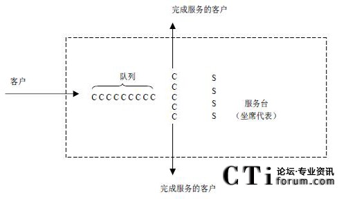 呼叫中心是一個典型的排隊系統(tǒng)。電話一個接著一個到來,接受各種服務(wù)。如果一個到達的客戶不能立即接受服務(wù),這個客戶就加入到一個隊列中進行等待,圖示是一個單隊列的排隊模型,如果呼叫中心擁有多個隊列,則需要構(gòu)造多個上述的排隊模型。