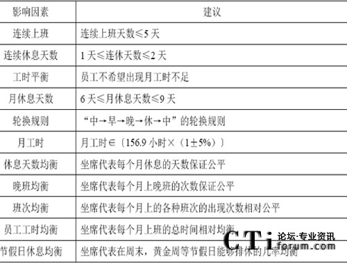 要滿足每半小時實際安排的座席數(shù)量不少于需要的座席數(shù)量的要求,首先就需要進行班次的設(shè)計,這是為第五環(huán)節(jié)資源規(guī)劃而準備的!鞍啻卧O(shè)計”是指設(shè)計出一系列的班次,比如早班,中班,晚班,等等。而將來只要告訴員工,你下個月每天各上什么樣的班次即可。在班次設(shè)計時,需要充分考慮前面提到的一些影響因素:如下所示。
