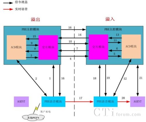 通過(guò)PBX/ACD建立一種電話路由共享和語(yǔ)音溢出的方法,實(shí)現(xiàn)多套聯(lián)絡(luò)中心平臺(tái)之間語(yǔ)音的動(dòng)態(tài)互溢,透明地為客戶提供優(yōu)質(zhì)、及時(shí)的電話服務(wù),客戶感覺(jué)不到任何差異。通過(guò)PBX/ACD建立一種電話路由共享和語(yǔ)音溢出的方法,作為行業(yè)現(xiàn)有實(shí)現(xiàn)方法的有效補(bǔ)充,解決了行業(yè)現(xiàn)有實(shí)現(xiàn)方法的無(wú)法實(shí)現(xiàn)最短路徑溢出問(wèn)題,通過(guò)ACD的“先排隊(duì)后進(jìn)門(mén)”的預(yù)約預(yù)定模式,動(dòng)態(tài)判斷彼此的運(yùn)行狀態(tài)和處理能力,無(wú)需先將語(yǔ)音溢出到另外一個(gè)聯(lián)絡(luò)中心,只有當(dāng)另外一個(gè)聯(lián)絡(luò)中心確定能提供相應(yīng)的語(yǔ)音服務(wù)和人工服務(wù)的時(shí)候,語(yǔ)音才在PBX語(yǔ)音層面通過(guò)標(biāo)準(zhǔn)通信協(xié)議進(jìn)行互聯(lián)互通,避免實(shí)時(shí)語(yǔ)音被多次溢出,實(shí)時(shí)實(shí)時(shí)語(yǔ)音溢出只走最短路徑,保證客戶電話只需一次溢出就能立即提供語(yǔ)音服務(wù)和人工服務(wù),大幅減少了語(yǔ)音溢出的處理時(shí)間,同時(shí)也大幅減少了語(yǔ)音處理次數(shù),提升了系統(tǒng)處理性能。