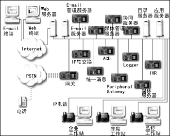 從上面的圖1、圖2中,可以看到IP通信大大簡化了企業(yè)的網(wǎng)絡(luò)通信結(jié)構(gòu)。但是為了實現(xiàn)不同的功能和應(yīng)用,網(wǎng)絡(luò)中仍然存在很多的服務(wù)器,各個品牌不同功能的服務(wù)器之間的協(xié)同成為最顯著的問題,同時維護和運行這樣大量的設(shè)備也需要大量的資源支持。而且,這僅是單點的客戶服務(wù)中心所需的配備,而在基于IP通信的分布式客戶服務(wù)中心的構(gòu)建中,所涉及的設(shè)備更多。