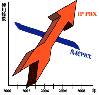 "2005年IP-PBX的使用線數(shù)將超過傳統(tǒng)PBX。從2001年開始傳統(tǒng)PBX以每年12%的速度在下降,IP-PBX以每年30%的速度增長"。