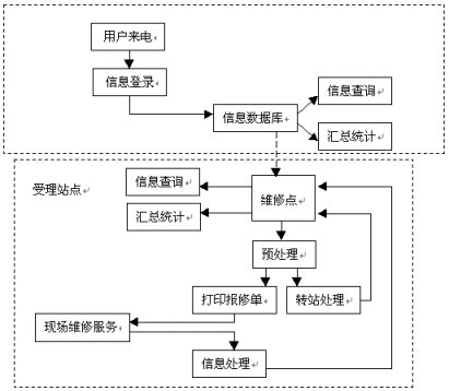 維修點(diǎn)對用戶的報修情況進(jìn)行預(yù)處理之后,根據(jù)用戶所在的區(qū)域,分配至最近距離的維修站,將用戶與其報修信息即時轉(zhuǎn)移,這也就是圖中所顯示的"轉(zhuǎn)站處理"。之后,維修站將直接打印出報修單,加快服務(wù)實(shí)施的效率、減少人工出錯的比例,有專業(yè)人員及時上門服務(wù)檢修。