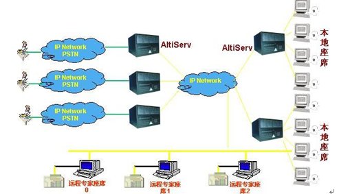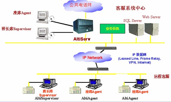這種組合節(jié)省管理成本,因為所有的座席員都在一點,便于管理控制,同時用戶只要撥打本地電話即可進入系統(tǒng)接收服務,如需人工座席應答的話系統(tǒng)會自動將來電通過Internet轉接到座席員處,對公司的話費成本也較低(都是通過Internet實現的長途轉接功能)。同時AltiGen也支持通過IP分機的方式遠程登錄到系統(tǒng)實現遠程座席的功能,這樣對有些高級話務員或專家座席,不必每天到公司上班,可以通過家里的電腦登錄到AltiGen系統(tǒng),作為系統(tǒng)的一個分機來完成所有的座席員的功能,在他的電腦屏幕上也能彈出來電人的信息。系統(tǒng)的組網圖如下:
